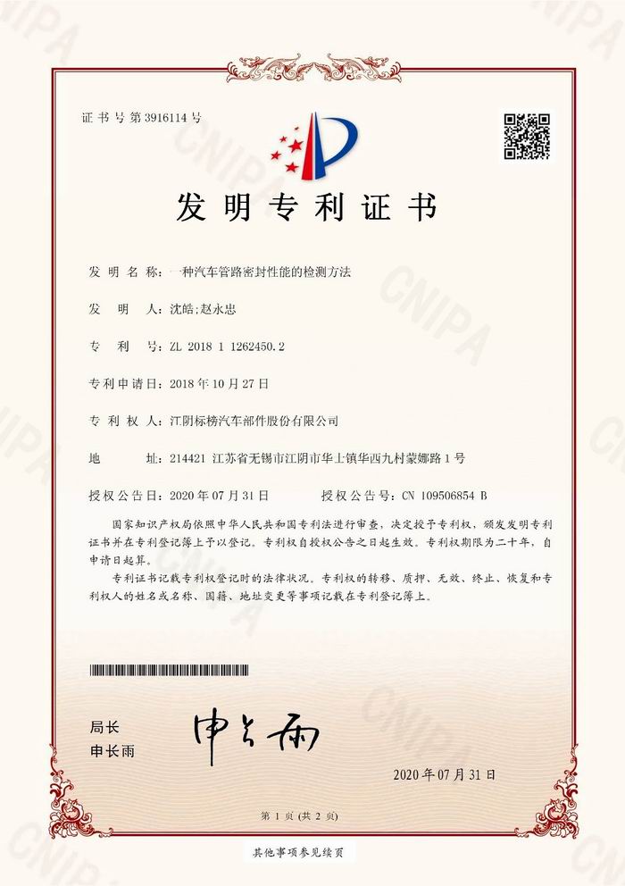 公司研發(fā)的“一種汽車(chē)管路密封性能的檢測(cè)方法”喜獲國(guó)家發(fā)明專(zhuān)利。